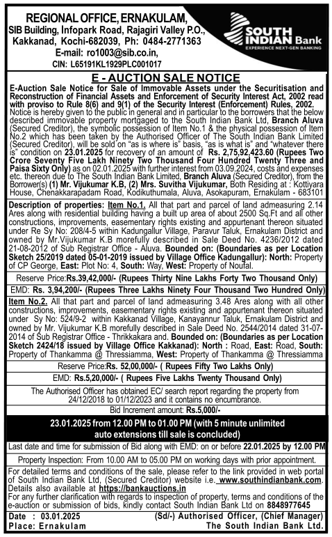 | Schedule of Property: | Description of properties: Item No.1, All that part and parcel of land admeasuring 2.14 Ares along with residential building having a built up area of about 2500 Sq.Ft and all other constructions, improvements, easementary rights existing and appurtenant thereon situated under Re Sy No: 208/4-5 within Kadungallur Village, Paravur Taluk, Ernakulam District and owned by Mr.Vijukumar K.B morefully described in Sale Deed No. 4236/2012 dated 21-08-2012 of Sub Registrar Office Aluva. Bounded on: (Boundaries as per Location Sketch 25/2019 dated 05-01-2019 issued by Village Office Kadungallur): North: Property of CP George, East: Plot No: 4, South: Way, West: Property of Noufal. |