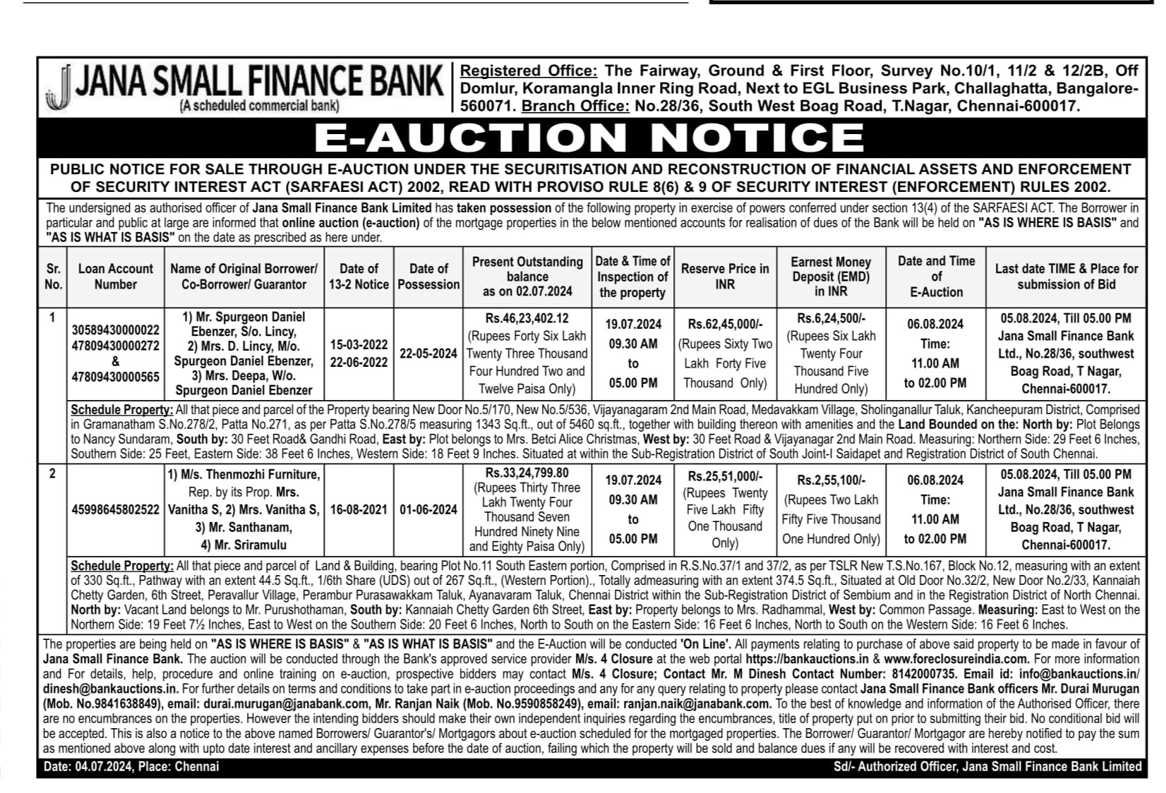 | Contact Details: | Contact The Authorized officer:Mr.Durai Murugan (Mob. No.9841638849), email: durai.murugan@janabank.com , Mr. Ranjan Naik (Mob. No.9590858249), email: ranjan.naik@janabank.com |