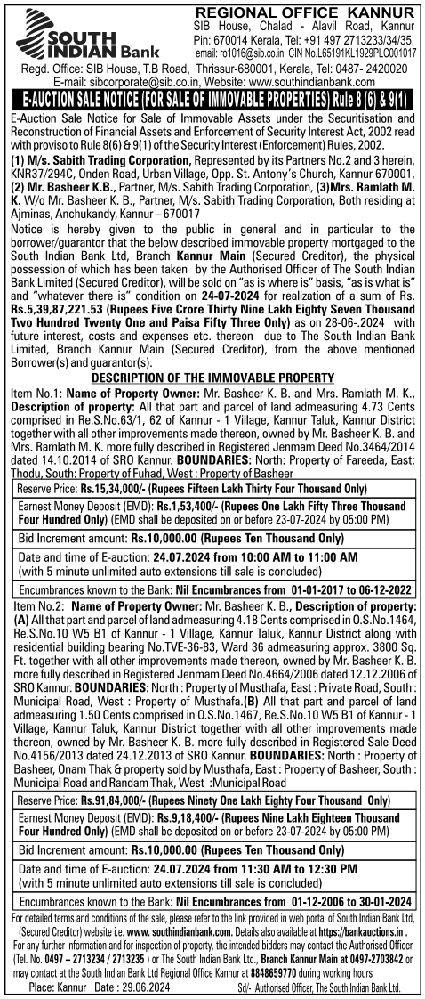 | Schedule of Property: | Item No.2: Name of Property Owner: Mr. Basheer K. B., Description of property:(A) All that part and parcel of land admeasuring 4.18 Cents comprised in O S No 1464, Re S No W5 B1 of Kannur - 1 Village, Kannur Taluk, Kannur District along with residential building bearing No. TVE-36-83, Ward 36 admeasuring approx 3800 Sq Ft. together with all other improvements made thereon, owned by Mr. Basheer K. B. more fully described in Registered Jenmam Deed No 4664/2006 dated 12.12.2006 of SRO Kannur. BOUNDARIES: North : Property of Musthafa, East: Private Road, South Municipal Road, West : Property of Musthafa.(B) All that part and parcel of land admeasuring 1.50 Cents comprised in W5 B1 of Kannur 1 Village, Kannur Taluk, Kannur District together with all other improvements made thereon, owned by Mr. Basheer K. B. more fully described in Registered Sale Deed No.4156/2013 dated 24.12.2013 of SRO Kannur. BOUNDARIES: North : Property of Basheer, Onam Thak & property sold by Musthafa, East Property of Basheer, South Municipal Road and Randam Thak, West :Municipal Road |