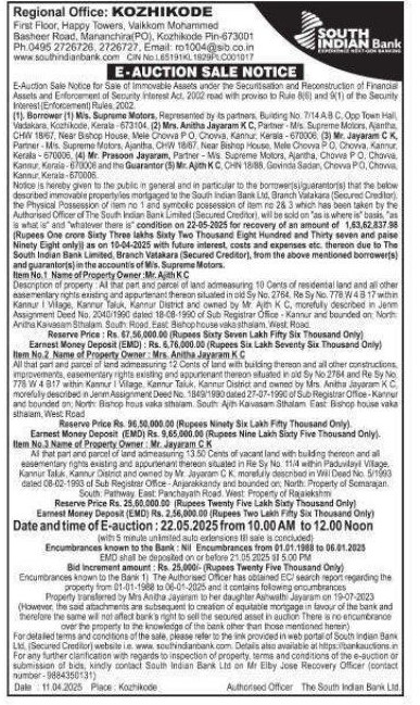 | Schedule of Property: | Item No.2: All that part and parcel of land admeasuring 12 Cents of land with building thereon and all other constructions improvements, easementary rights existing and appurtenant thereon situated in old Sy No 2764 and Re Sy No 778 W 4 B17within Kannur I Village, Kannur Taluk, Kannur District and owned by Mrs. Anitha Jayaram KC morefully described in Jenm Assignment Deed No. 1849/1990 dated 27-07-1990 of Sub Registrar Office-Kannur and bounded on: North: Bishop frous vaka sthalam. South Ah Kavasam Sthalam Fast Bishop house vaka sthalam, West Road |