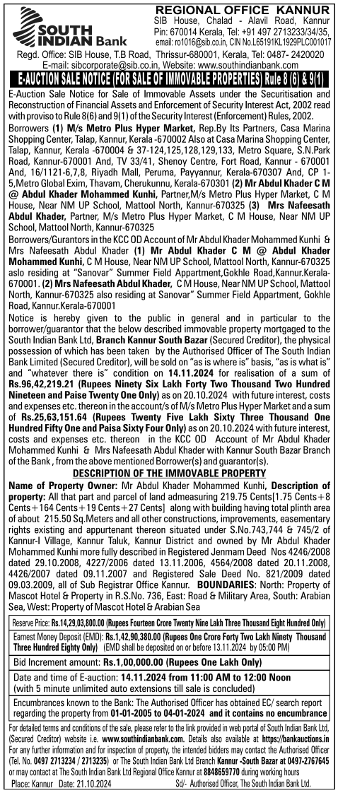 | Contact Details: | Contact The Authorized Officer: 0497-2713234 / 2713235, 0497-2767645, 8848659770 |