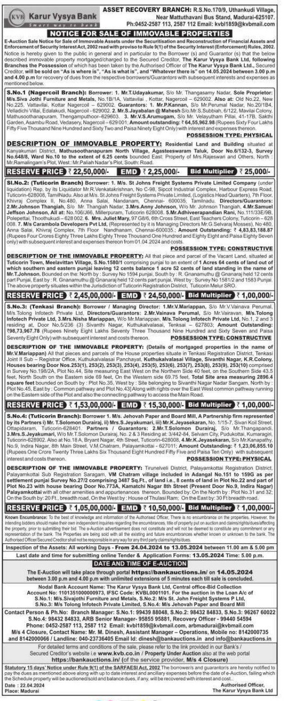 | Contact Details: | Contact the Authorized Officer: Branch-Manager-99439 88048 ARB Chief Manager- 95855 95881, Recovery Officer-99440 54594 Email: arbmadurai@kvbmail.com |
