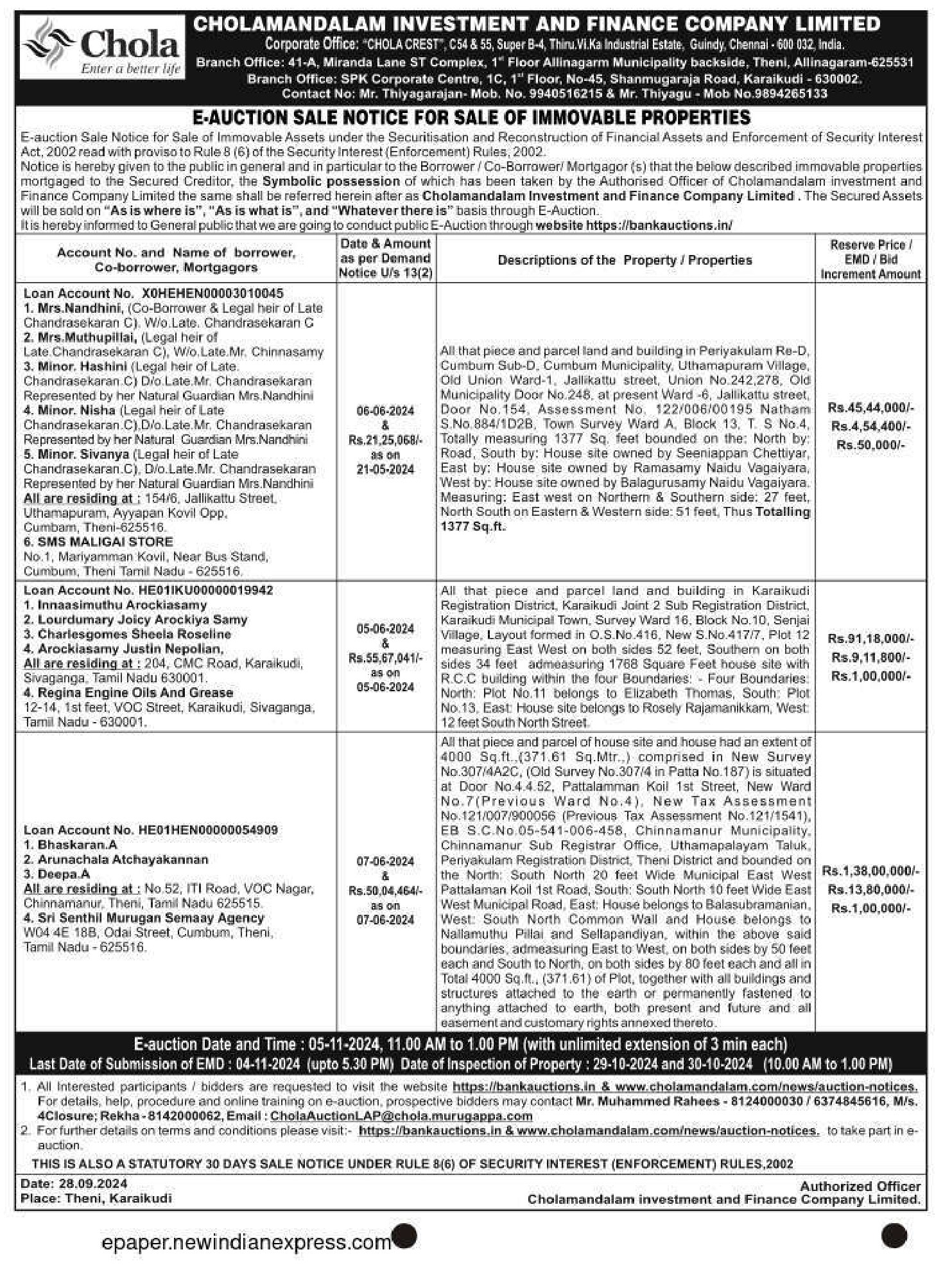 | Contact Details: | Contact The Authorized Officer : Mr. Thiyagarajan- Mob. No. 9940516215 & Mr. Nandakumar - Mob 9894058786, Mr. Muhammed Rahees - 8124000030 / 6374845616 |