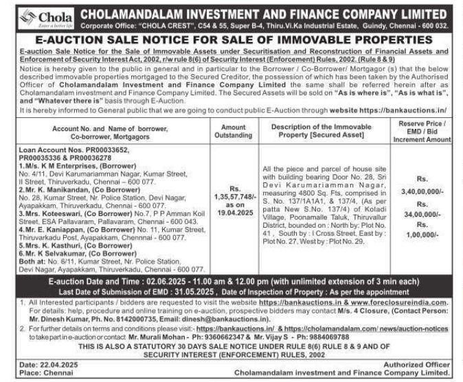 | Contact Details: | Contact The Authorized Officer: Mr. Murali Mohan - 9360662347 Mr. Vijay S - 9884069788, Mr. Mohammed Rahees - 8124000030 |
