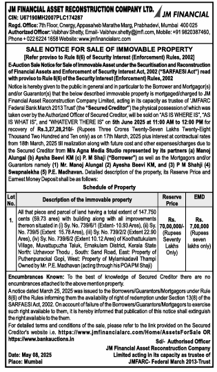 | Schedule of Property: | All that piece and parcel of and having a total extent of 147.750 cents (59.73 ares) with building along with all improvements thereon situated in (i) Sy. No. 739/6/1 (Extent- 10.93 3Ares).(i))Sy No. 739/5 (Extent 15.78 Area) (ii) Sy. No. 739/2/2 Extent 22.90 Ares). (iv) Sy. No. 739/6/2 (Extent 10.13 Ares) of Koothattukulam Village, Muvattupuzha Taluk Ernakulam District Kerala State North: Uzhavoor Thodu, South: Sand Road, East Property of Puthenpurackal Gopi West Property of Mylamkadavil Thampi Owned by Mr. P.E. Madhavan (acting through his POA PM Shaji) |