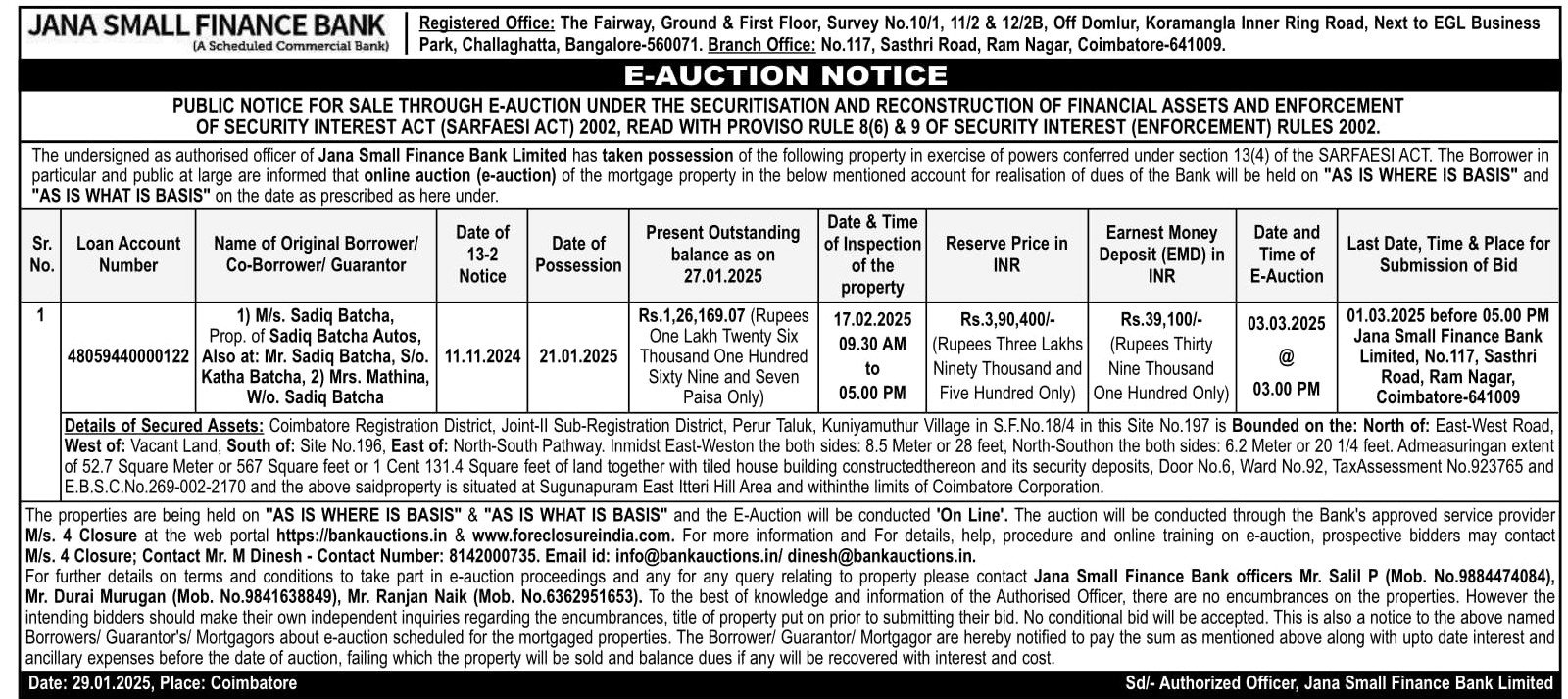 | Contact Details: | Contact The Authorized Officer: Mr Salil P 9884474084, Mr Durai Murugan 9841638849, Mr Ranjan Naik 6362951653 |