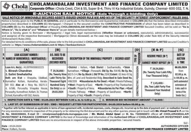 | Contact Details: | Contact the Authorized Officer : Mr. Vimal Prasad V. P. on his M. No. 9846358600, E-mail ID : vimalprasadvp@chola.murugappa.com/ Mr. Mohd. Abdul Qawi on M. No. 7305990872. |