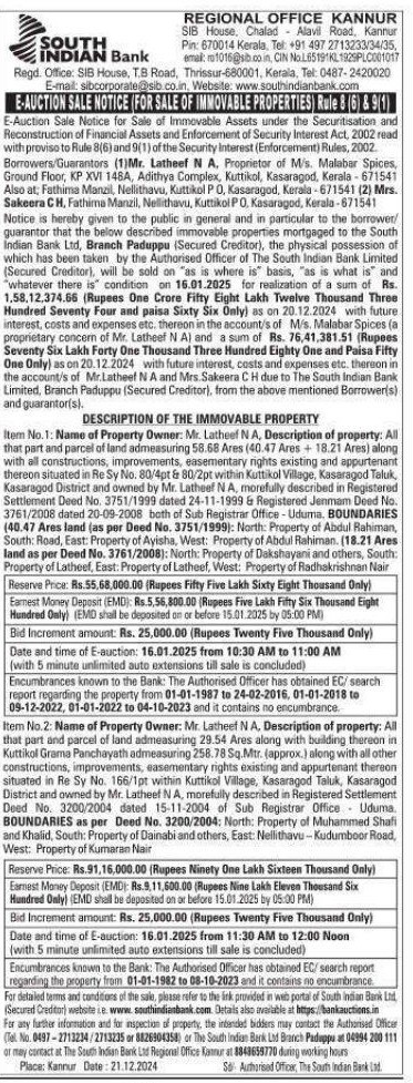 | Inspection Details: | Property Inspection Contact the Authorized Officer : 0497-2713234 / 2713235 or 8826904358, Branch Paduppu at 04994-200111 or Regional Office, Kannur at 8848659770. |
