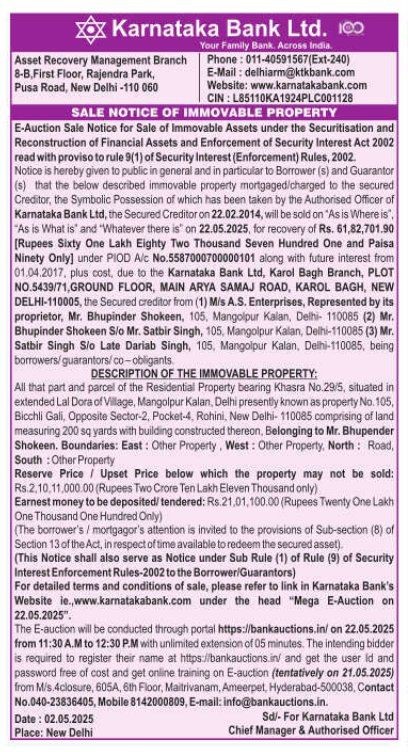 | Schedule of Property: | All that part and parcel of the Residential Property bearing Khasra no.29/5. situated in extended Lal Dora of Village, Mangolpur Kalan, Delhi presently known as property No. 105, Bicchli Gali, Opposite Sector-2 Pocket-4 Rohini, New Delhi- 110085 comprising of land measuring 200 sq yards with building constructed thereon. Belonging to Mr. Bhupender Shokeen. Boundaries: East : Other Property West : Other Property, North Road, South Other Property |