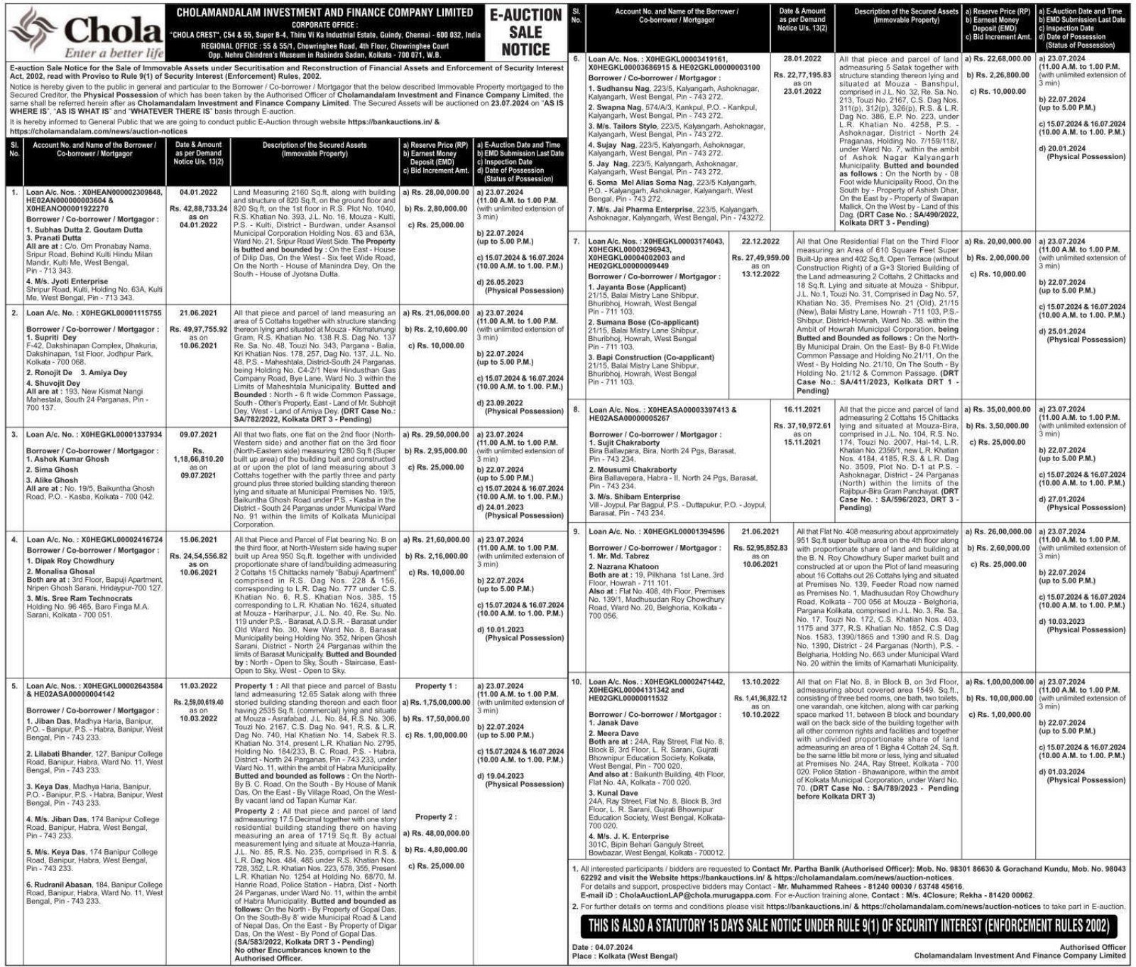 | Contact Details: | Contact the Authorized Officer : Mr. Partha Banik Mob. No. 98301 86630, Gorachand Kundu, Mob. No. 9804362292, Muhammed Rahees - 8124000030 |