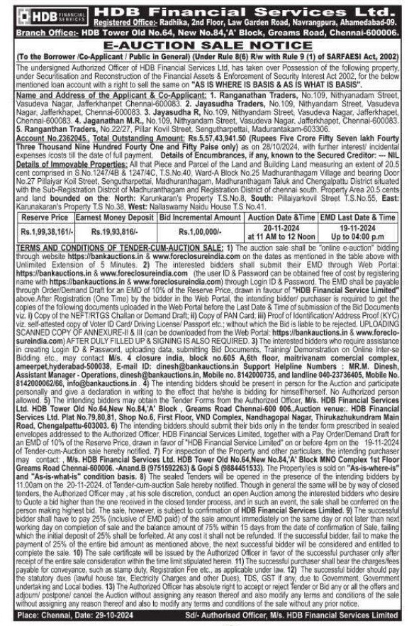 | Contact Details: | Contact The Authorized Officer: Anand B - 9751592263, Gopi S - 9884451533 |