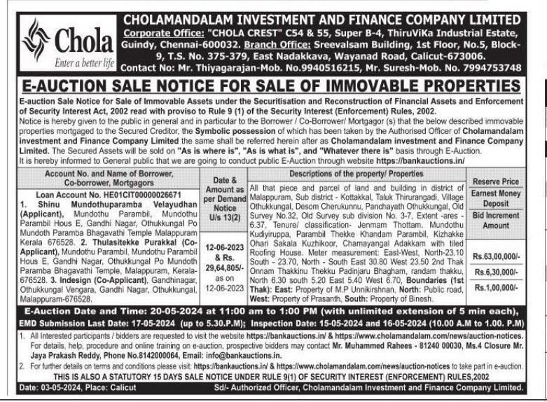 | Contact Details: | Contact Authorized Officer : Mr. Thiyagarajan Mob.No.:9940516215 , Mr.Suresh Mob.No.:7994753748 |