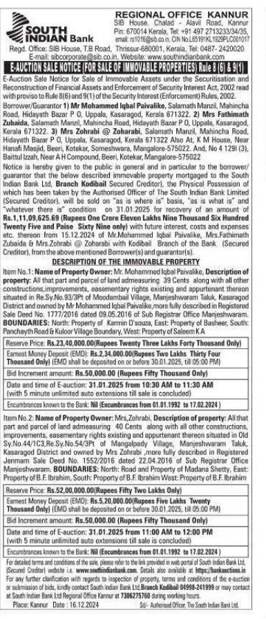 | Schedule of Property: | Item No.2 Name of Property Owner Mrs, Zohrabi Description of property All that part and parcel of land admeasuring 40 Cents along with all other constructions. improvements easementary rights existing and appurtenant thereon situated in Old Sy.No.44/1C3,Re.Sy.No.54/3Pt of Mangalpady Village Manjeshwaram Taluk, Kasaragod District and owned by Mrs Zohrabi, more fully described in Registered Jenmam Sale Deed No. 1552/2016 dated 22.04.2016 of Sub Registrar Office Manjeshwaram. BOUNDARIES North Road and Property of Madana Shetty, East Property of B.F. Ibrahim, South Property of B.F. Ibrahim West: Property of B.F. Ibrahim |