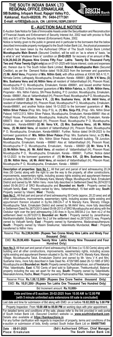 | Schedule of Property: | Item No.3: All that part and parcel of land admeasuring 5.46 Ares (i.e. 13.50 Cents) along with building and all other constructions, improvements, easementary rights, including access rights existing and appurtenant thereon situated in Sy. No. 391/7-6 of N. Marady Kara, Marady Village, Muvattupuzha Taluk, Ernakulam District and owned by Mr. Venu V K and Mrs. Sushama Venu, more fully described in Sale Deed No. 4729/1985 dated 26-12-1985 of SRO Muvattupuzha and Bounded on: North: Property owned by Radhakrishnan, son of Neelakanta Pillai, Valanikkattu, East: 6.750 Cents of land sold to Sathyavan, Thekkumkudiyil, Balance property including the way set apart for the way, South: Property owned by Valanikkattu Meenakshi Amma Radha, West: Property owned by Padmanabha Pillai, Valanikkattu, Drainage |