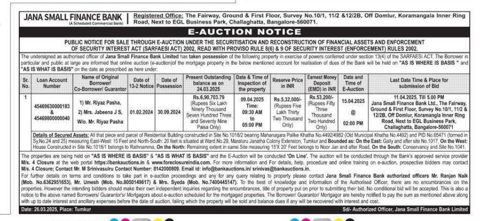 | Contact Details: | Contact The Authorized Officer : Mr. Ranjan Naik 6362951653, Mr Umesh 8050149617 Mrs Syeda 7400445147 |