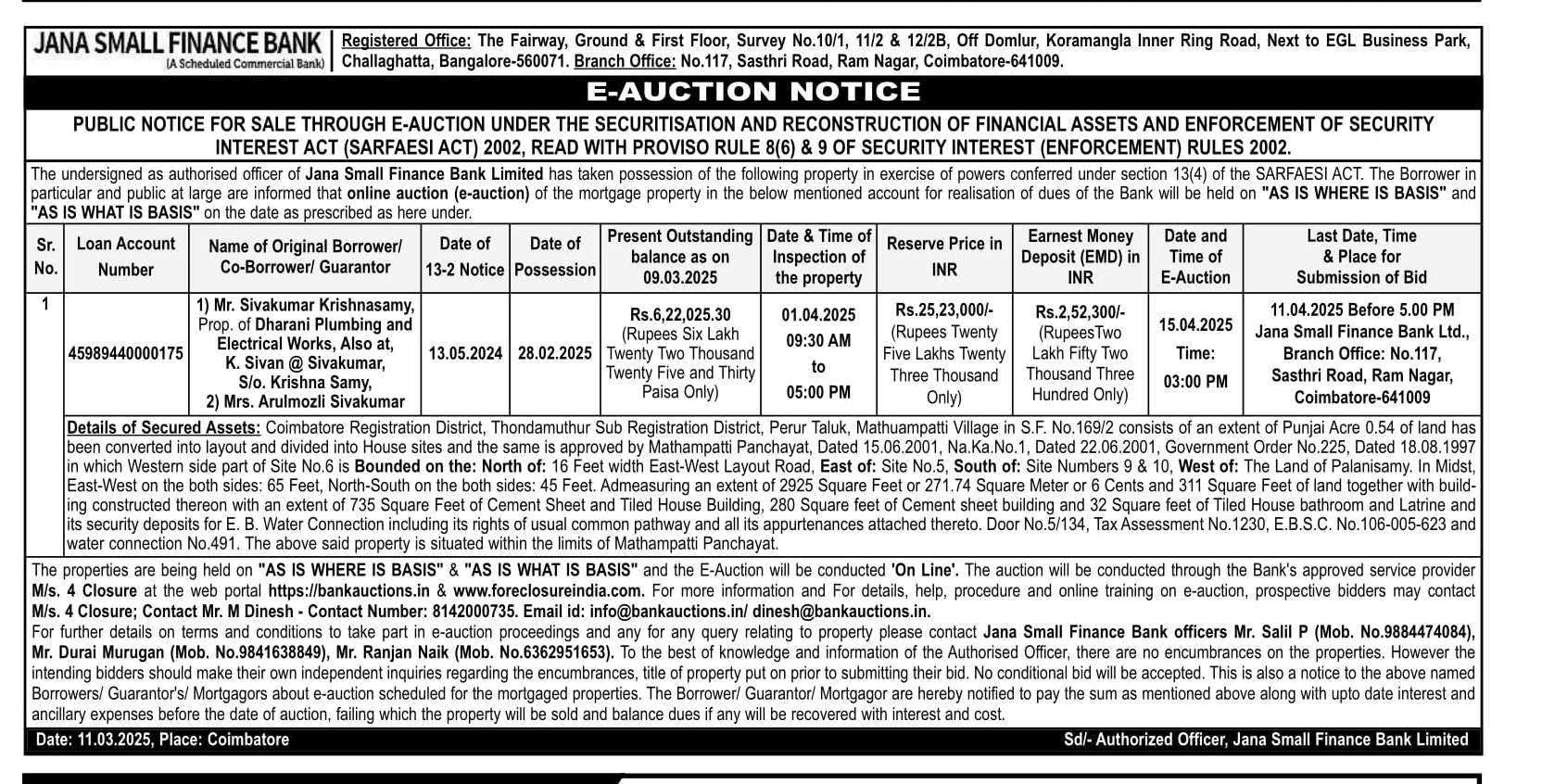 | Contact Details: | Contact The Authorized Officer: Mr. Salil P - 9884474084, Mr. Durai Murugan - 9841638849, Mr. Ranjan Naik - 6362951653 |