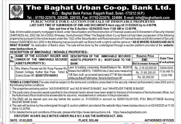 | Schedule of Property: | Land & building comprising Khata/Khatauni No. 402/618 Khasra No1285/915, 1166/916 kita 2 land area measuring 108 Sqm, built up (covered area) area 377.96 Sqm situated at Mauza Basal Patti Kather, Tehsil & Distt Solan HP |