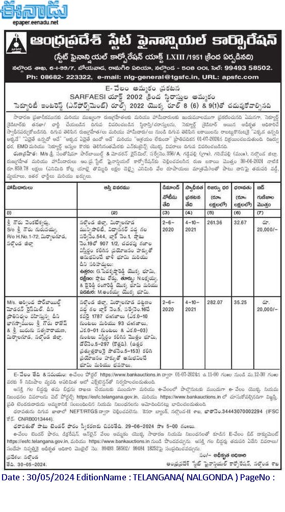 | Schedule of Property: | Freehold interest in land and Buildings bearing Door No.5-297 (New) (Corresponding Old No.5-153), total land admeasuring 1787 Sq.yds, (Ac.0-10 guntas and 93 Sq.yds, Ac.0-01 gts & Ac.0-03 gts) covered by Sy.No.16, Block No 5 situated at Miryalguda Town, Nalgonda District |