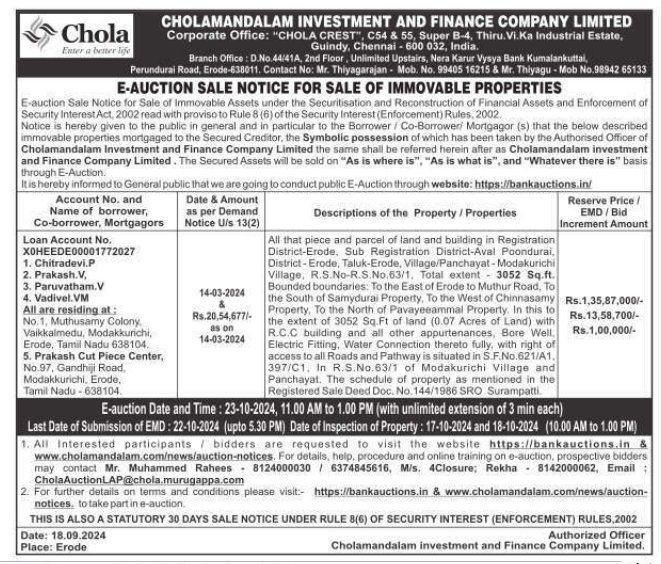 | Contact Details: | Contact The Authorized Officer: Mr. Thiyagarajan - Mob. No. 99405 16215 & Mr. Thiyagu - Mob No.98942 65133 Mr. Muhammed Rahees 8124000030 / 6374845616 |