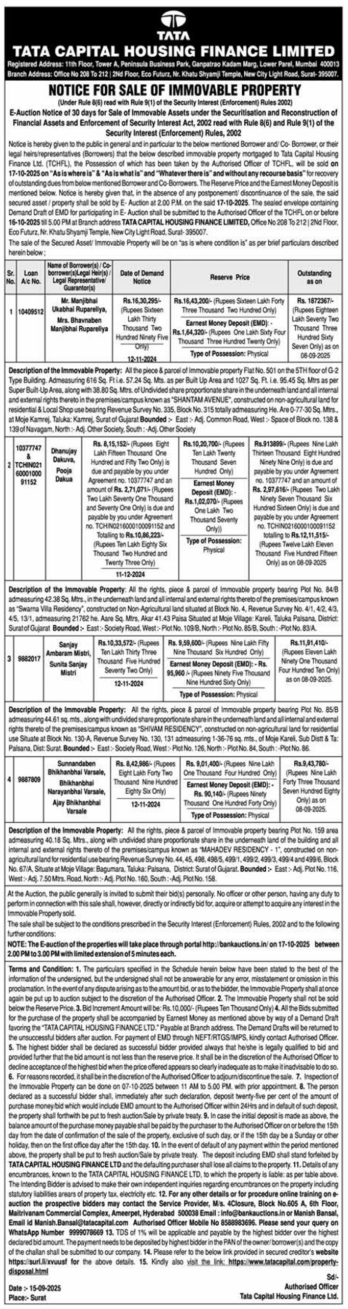 | Contact Details: | Contact The Authorized Officer : Manish Bansal, Email ID: manish.bansal@tatacapital.com, . 8588983696 / 9999078669 |