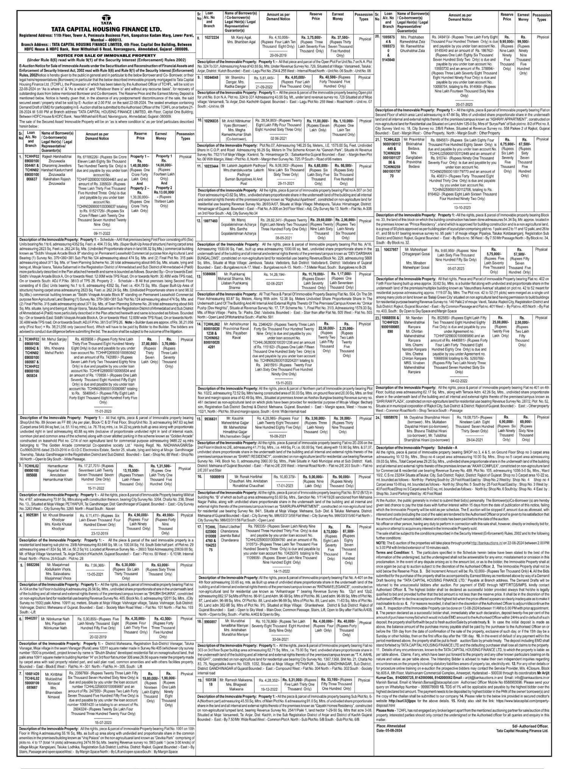 | Contact Details: | Contact The Authorized Officer: Manish Bansal 85889983696,9999078669, Email:Manish.Bansal@tatacapital.com |