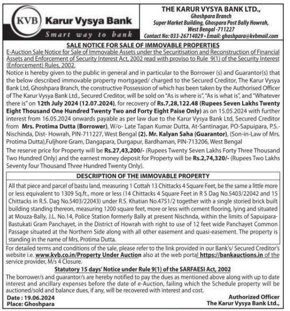 | Schedule of Property: | All that piece and parcel of bastu land, measuring 1 Cottah 13 Chittacks 4 Square Feet, be the same a little more or less equivalent to 1309 Sq.ft., more or less (14 Chittacks 4 Square Feet in Dag No.5403/22042 and 15 Chittacks in R.S. Dag No. 5.5403/22043) under R.S. Khatian No. 4751/2 together with a single storied brick built at Mouza-Bally, J.L. No.1 Police Station formerly Bally at present Nischnda, within the limits of Sapuipara-Bastukati Gram Panchayet, in the District of Howrah with right to use of 12 feet wide Panchayet Common Passage situated at the Northern Side along with all other easement and quasi-easement. The property is standing in the name of Mrs. Protima Dutta. |