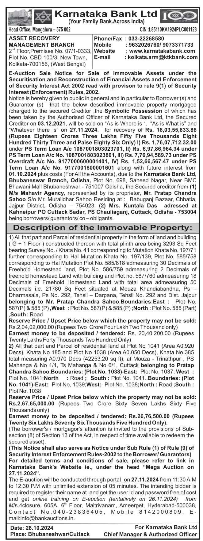 | Schedule of Property: | 1) All that part and Parcel of residential property in the form of land and building G 1 Floor ) constructed thereon with total plinth area being 3293 Sq Feet bearing Survey No. Khata No. 41 corresponding to Mutation Khata No. 197/71 further corresponding to Hal Mutation Khata No. 197/139, Plot No. 585/758 corresponding to Hal Mutation Plot No. 585/818 admeasuring 30 Decimals of Freehold Homestead land, Plot No. 586/759 admeasuring 2 Decimals of freehold homestead Land with building and Plot no. 587/760 admeasuring 18 Decimals of Freehold Homestead Land with total area admeasuring 50 Decimals i.e. 21780 Sq Feet situated at Mouza Khandiabandha, Ps - Dharmasala, Ps No. 292, Tehsil - Darpana, Tehsil No. 292 and Dist. Jajpur belonging to Mr. Pratap Chandra Sahoo.Boundaries:East : Plot No. 587(P) & 585 (P), West : Plot No. 587(P) & 585 (P) North Plot No. 585 (Part) South: Road |