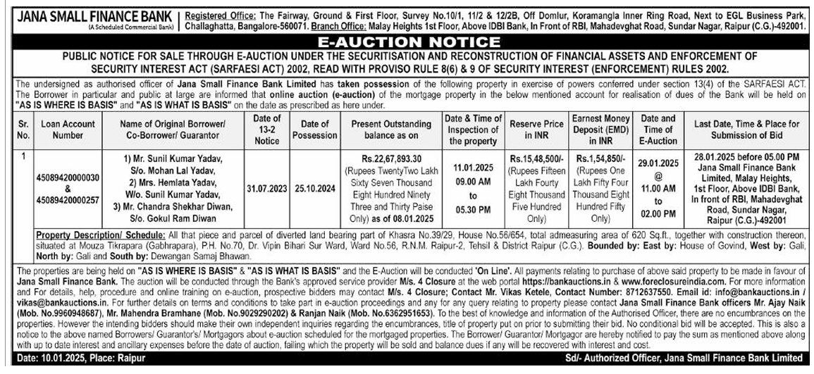| Schedule of Property: | Property Description/ Schedule: All that piece and parcel of diverted land bearing part of Khasra No.39/29, House No.56/654, total admeasuring area of 620 Sq.ft., together with construction thereon, situated at Mouza Tikrapara (Gabhrapara), P.H. No.70, Dr. Vipin Bihari Sur Ward, Ward No.56, R.N.M. Raipur-2, Tehsil & District Raipur (C.G.). Bounded by: East by: House of Govind, West by: Gali, North by: Gali and South by: Dewangan Samaj Bhawan |