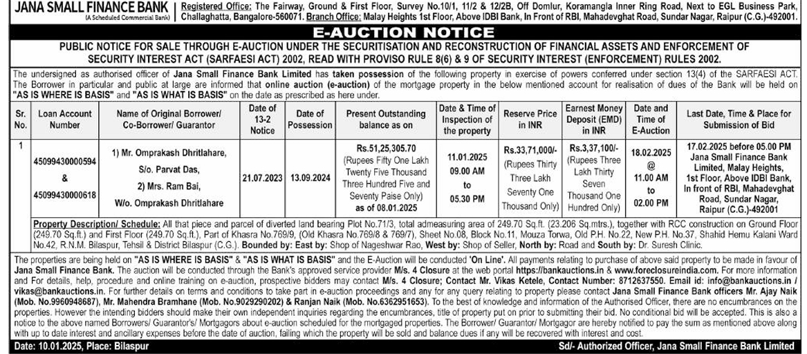 | Schedule of Property: | Property Description/ Schedule: All that piece and parcel of diverted land bearing Plot No.71/3, total admeasuring area of 249.70 Sq.ft. (23.206 Sq.mtrs.), together with RCC construction on Ground Floor (249.70 Sq.ft.) and First Floor (249.70 Sq.ft.), Part of Khasra No.769/9, (Old Khasra No.769/8 & 769/7), Sheet No.08, Block No.11, Mouza Torwa, Old P.H. No.22, New P.H. No.37, Shahid Hemu Kalani Ward No.42, R.N.M. Bilaspur, Tehsil & District Bilaspur (C.G.). Bounded by: East by: Shop of Nageshwar Rao, West by: Shop of Seller, North by: Road and South by: Dr. Suresh Clinic. |