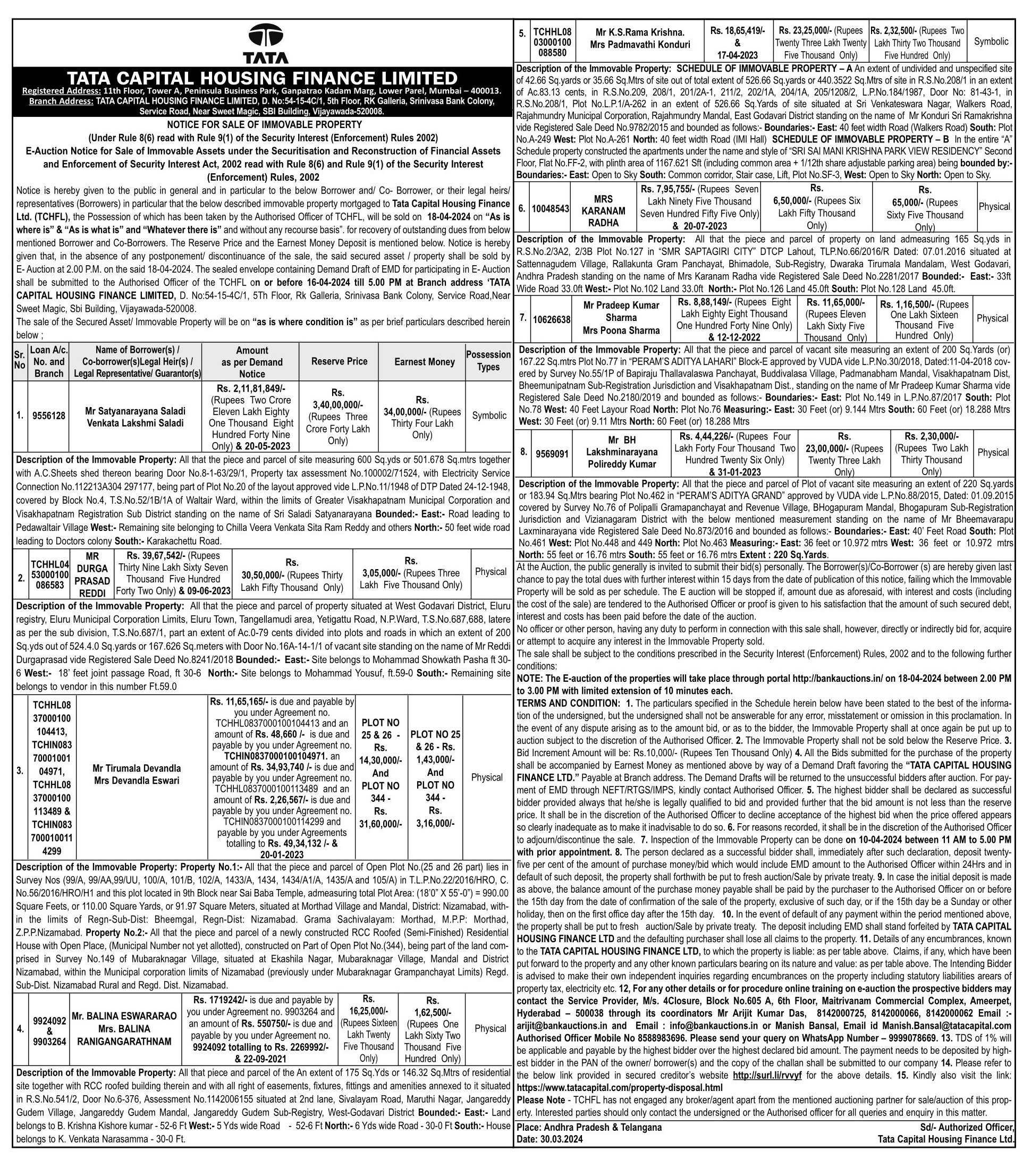 | Contact Details: | Contact The Authorized Officer: Manish Bansal - 8588983696. WhatsApp Number - 9999078669, Email id Manish.Bansal@tatacapital.com |