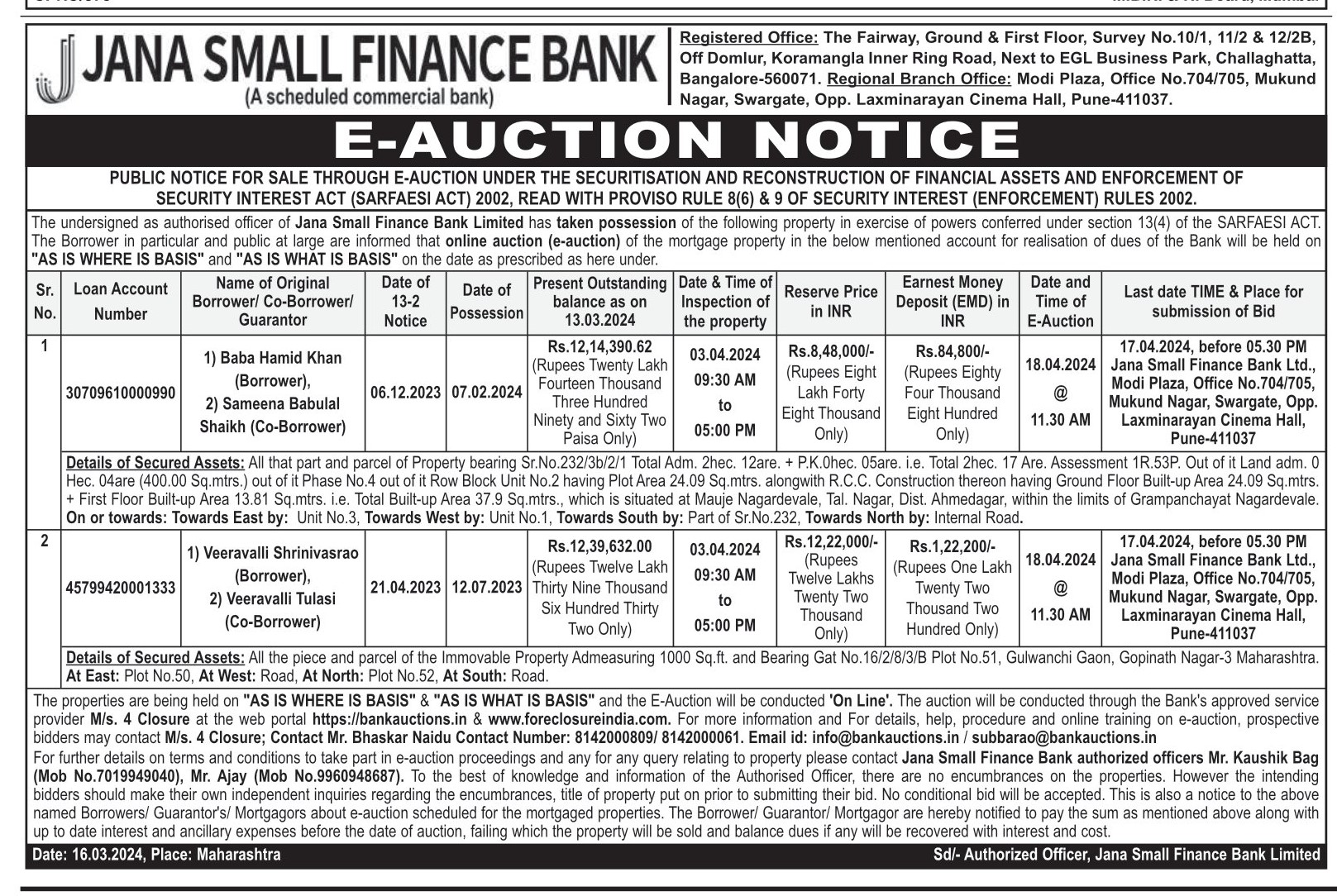 | Contact Details: | Contact Authorized Officer : Mr. Kaushik Bag (Mob No.7019949040), Mr. Ajay (Mob No.9960948687). |