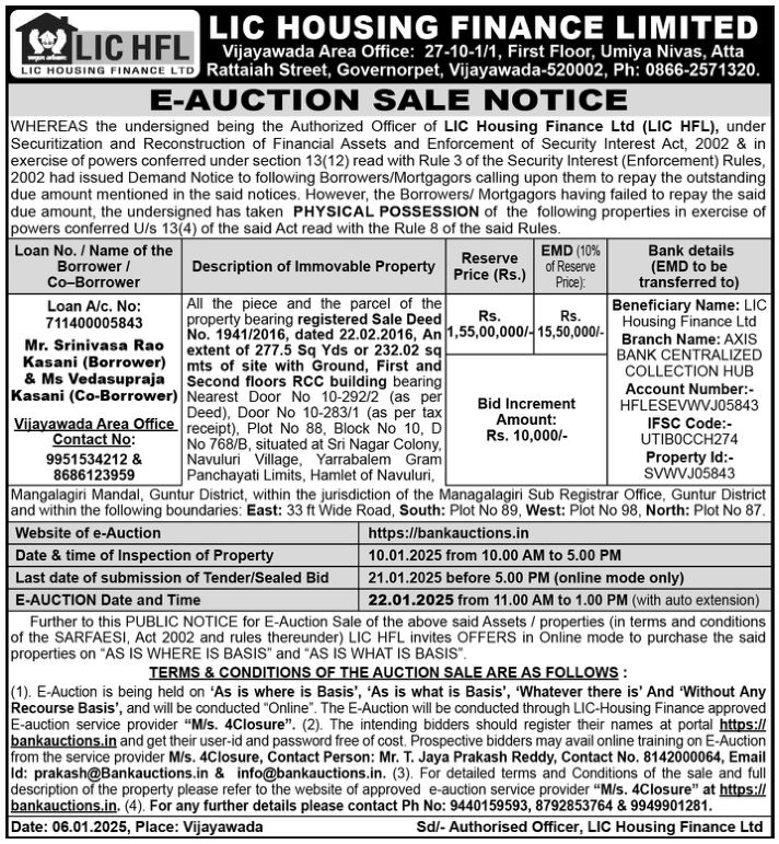 | Start Date and Time of Auction: | 22-01-2025 11:00 am |