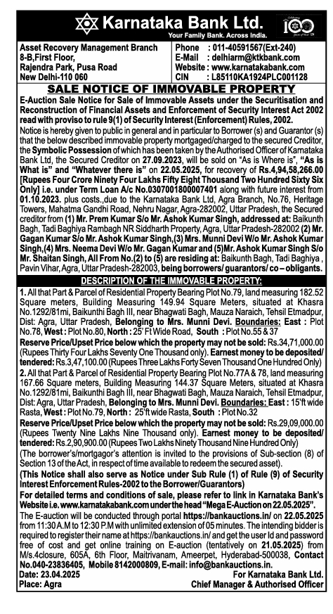 | Schedule of Property: | 1. All that Part & Parcel of Residential Property Bearing Plot No.79, land measuring 182.52 Square meters, Building Measuring 149.94 Square Meters, situated at Khasra No.1292/81mi, Baikunthi Bagh III, near Bhagwati Bagh, Mauza Naraich, Tehsil Etmadpur, Dist: Agra, Uttar Pradesh, Belonging to Mrs. Munni Devi. Boundaries: East: Plot No.78, West: Plot No.80, North: 25 Ft Wide Road, South: Plot No.55 & 37 |