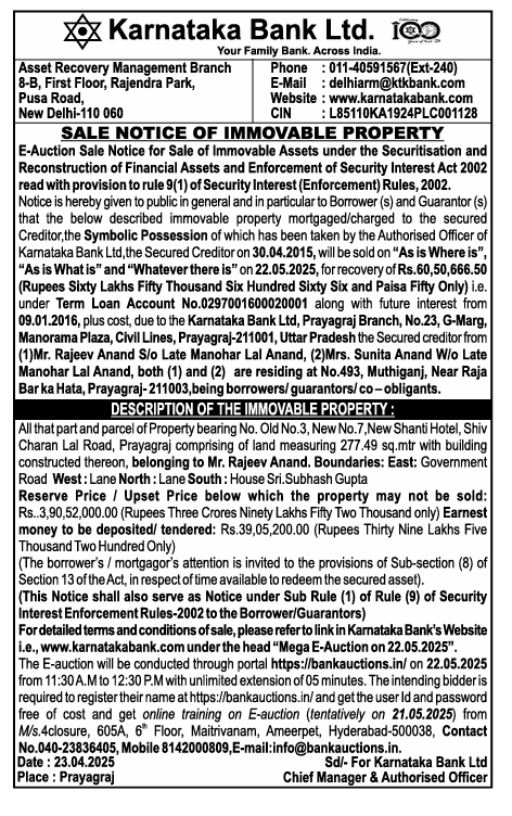 | Schedule of Property: | All that part and parcel of Property bearing No. Old No.3, New No.7, New Shanti Hotel, Shiv Charan Lal Road, Prayagraj comprising of land measuring 277.49 sq.mtr with building constructed thereon, belonging to Mr. Rajeev Anand. Boundaries: East: Government Road West: Lane North: Lane South: House Sri. Subhash Gupta |