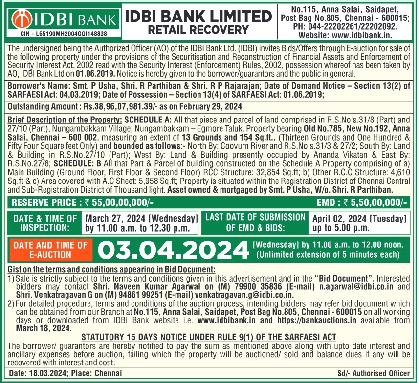 | Start Date and Time of Auction: | 03-04-2024 11:00 am |