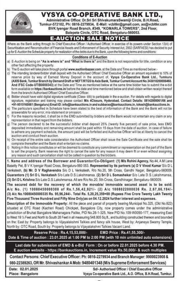 | Inspection Details: | Property Inspection Contact The Authorized Officer : 0816-2279934, 9900023908, 080-22389263, Mr. Shivashankar A 9480401348 |