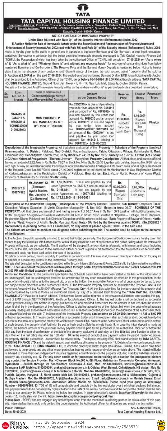 | Contact Details: | Contact the Authorized Officer : Manish Bansal Mobile No 8588983696, 9999078669, Email Id Manish.Bansal@tatacapital.com |