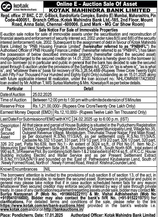 | Contact Details: | Contact The Authorized Officer: Mr. Suriya Narayanan P - Mob No. +919600222111, Mr. Vishal Adhisheshan - Mob No +919941016600 |