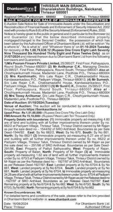 | Schedule of Property: | Property Details with boundaries: (1) Immovable property ad-measuring 4.80 are of land and building with all further improvements thereon under Sy no 662/2 at Padiyam Village Thrissun Taluk Thrissun District owned by Mr Rajan as per the sale deed no - 1544/92 of SRO Anthikad Boundaries as per Sale Deed-1544/92 East: Sy No 662/2 West: Sy No 670, South: Sy No 661, North: Sy No 662/1 (2) Immovable property ad -measuring 6.27 are of land and building with all further improvements thereon under Sy no. 662/2 at Padiyam Village, Thrissur Taluk Thrissur District owned by Mr Rajan as per the sale deed no - 291/96 of SRO Anthikad Boundaries as per Sale Deed- 291/96. East Property of Palliyil Sathyavathy, West Property of Rajan, South: Property of Balan, North Property of Mr Rajan (3) a) Immovable property ad-measuring 1.62 are of land with all further improvements thereon under Sy no. 670/3 at Padiyam Village, Thrissur Taluk. (Full details available in sale notice) |
