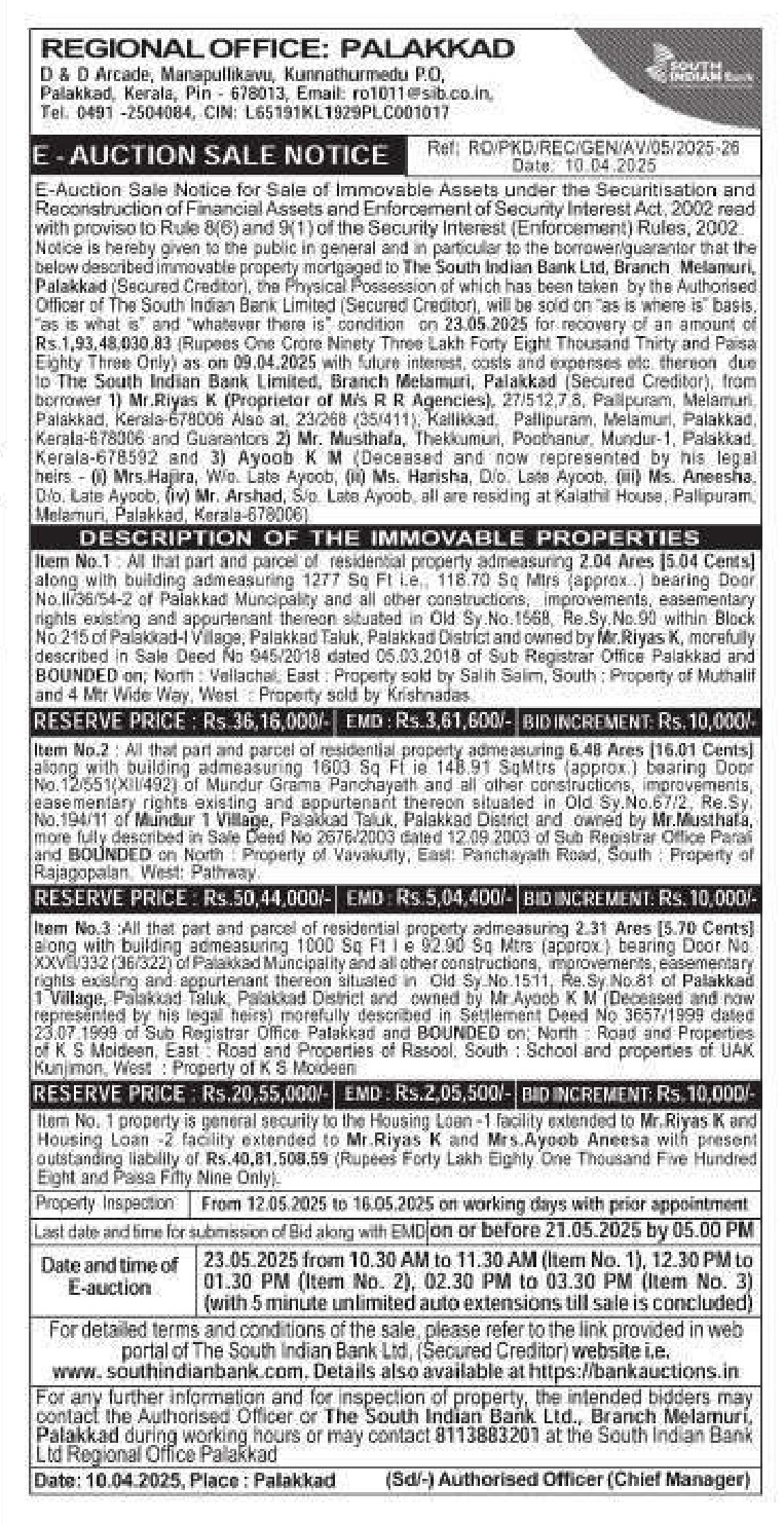 | Schedule of Property: | Item No.3 All that part and parcel of residential property admeasuring 2.31 Ares [5.70 Cents) along with building admeasuring 1000 Sq Ft le 92.90 Sq Mtrs (approx.) bearing Door No XXV/332 (36/322) of Palakkad Muncipality and all other constructions, improvements, easementary rights existing and appurtenant thereon situated in Old Sy No. 1511, Re. Sy No.81 of Palakkad 1 Village, Palakkad Taluk, Palakkad District and owned by Mr. Ayoob KM (Deceased and now represented by his legal heirs) morefully described in Settlement Deed No 3657/1999 dated 23.07.1999 of Sub Registrar Office Palakkad and BOUNDED on: North Road and Properties of KS Moideen, East Road and Properties of Rasool, South School and properties of UAK Kuniimon, West: Property of KS Moideen |
