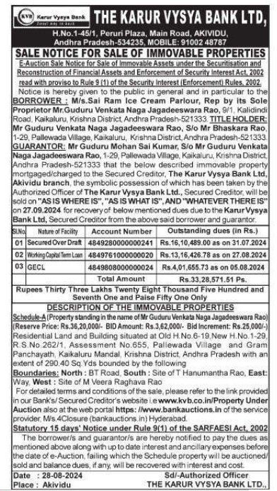 | Schedule of Property: | Schedule-A (Property standing in the name of Mr Guduru Venkata Naga Jagadeeswara Rao)Residential Land and Building situated at Old No.6-19 New H.No.1-29 R.S. 262/1 Assessment No 655, Pallewada Village and Gram Panchayath Kaikaluru Mandal Krishna District Andhra Pradesh with an extent of 290.40 Sq Yds bounded by the followingBoundaries: North BT Road, South Site of T Hanumantha Rao East: Way West Site of M Veera Raghava Rao |