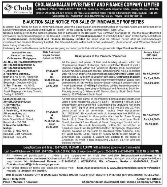 | Contact Details: | Contact the Authorized Officer : Muhammed Rahees - 8124000030 / Mr. Thiyagarajan- Mob. No. 9940516215 & Mr. Thiyagu - Mob. No. 9894265133. |