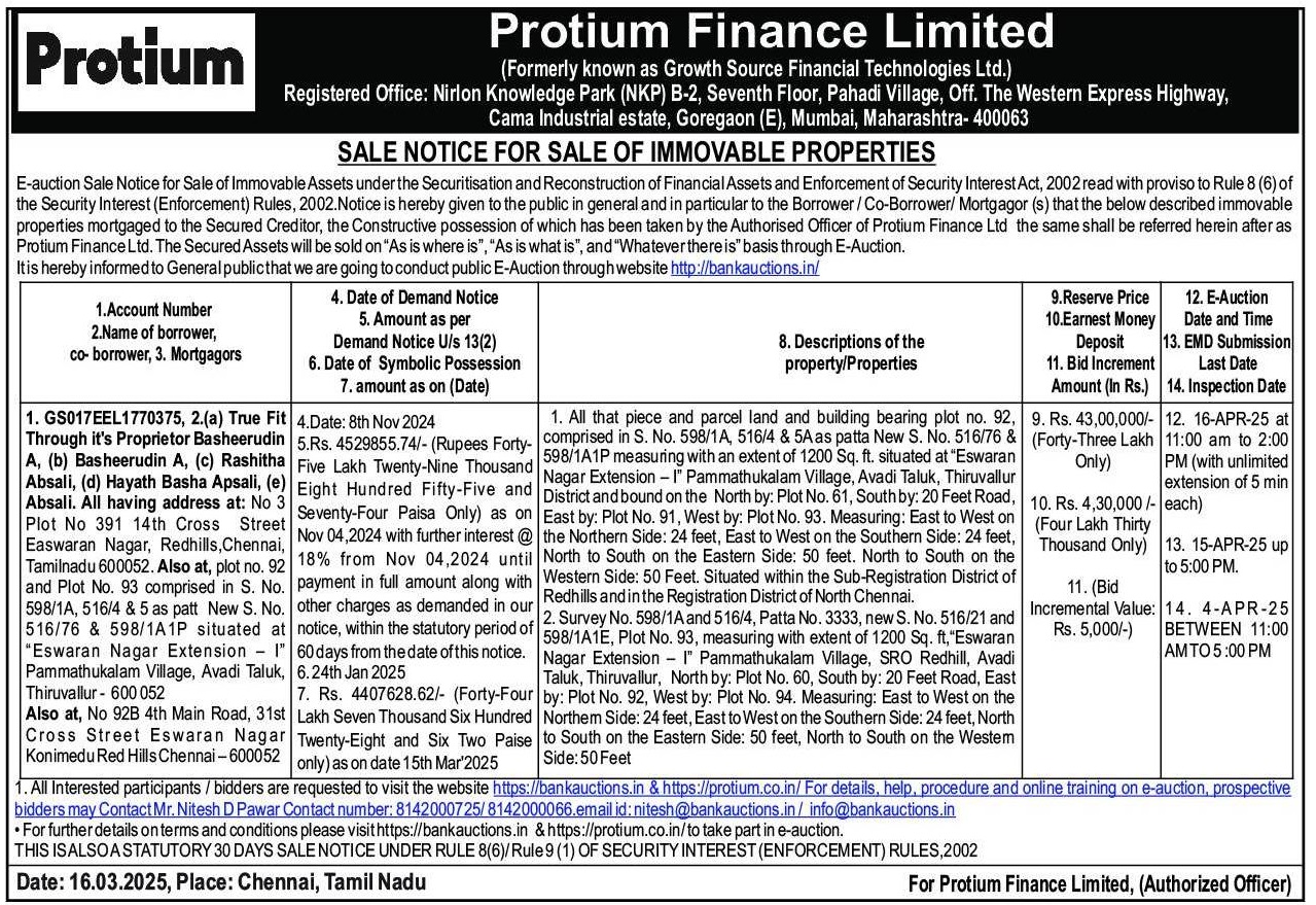 | Schedule of Property: | 1. All that piece and parcel land and building bearing plot no. 92, comprised in S. No. 598/1A, 516/4 & 5A as patta New S. No. 516/76 & 598/1A1P measuring with an extent of 1200 Sq. ft. situated at "Eswaran Nagar Extension - I" Pammathukalam Village, Avadi Taluk, Thiruvallur District and bound on the North by: Plot No. 61, South by: 20 Feet Road, East by: Plot No. 91, West by: Plot No. 93. Measuring: East to West on the Northern Side: 24 feet, East to West on the Southern Side: 24 feet, North to South on the Eastern Side: 50 feet. North to South on the Western Side: 50 Feet. Situated within the Sub-Registration District of Redhills and in the Registration District of North Chennai.2. Survey No. 598/1A and 516/4, Patta No. 3333, new S. No. 516/21 and 598/1A1E, Plot No. 93, measuring with extent of 1200 Sq. ft, "Eswaran Nagar Extension - I" Pammathukalam Village, SRO Redhill, Avadi Taluk, Thiruvallur, North by: Plot No. 60, South by: 20 Feet Road, East by: Plot No. 92, West by: Plot No. 94. Measuring: East to West on the Northem Side: 24 feet, East to West on the Southern Side: 24 feet, North to South on the Eastern Side: 50 feet, North to South on the Westem Side: 50 Feet |