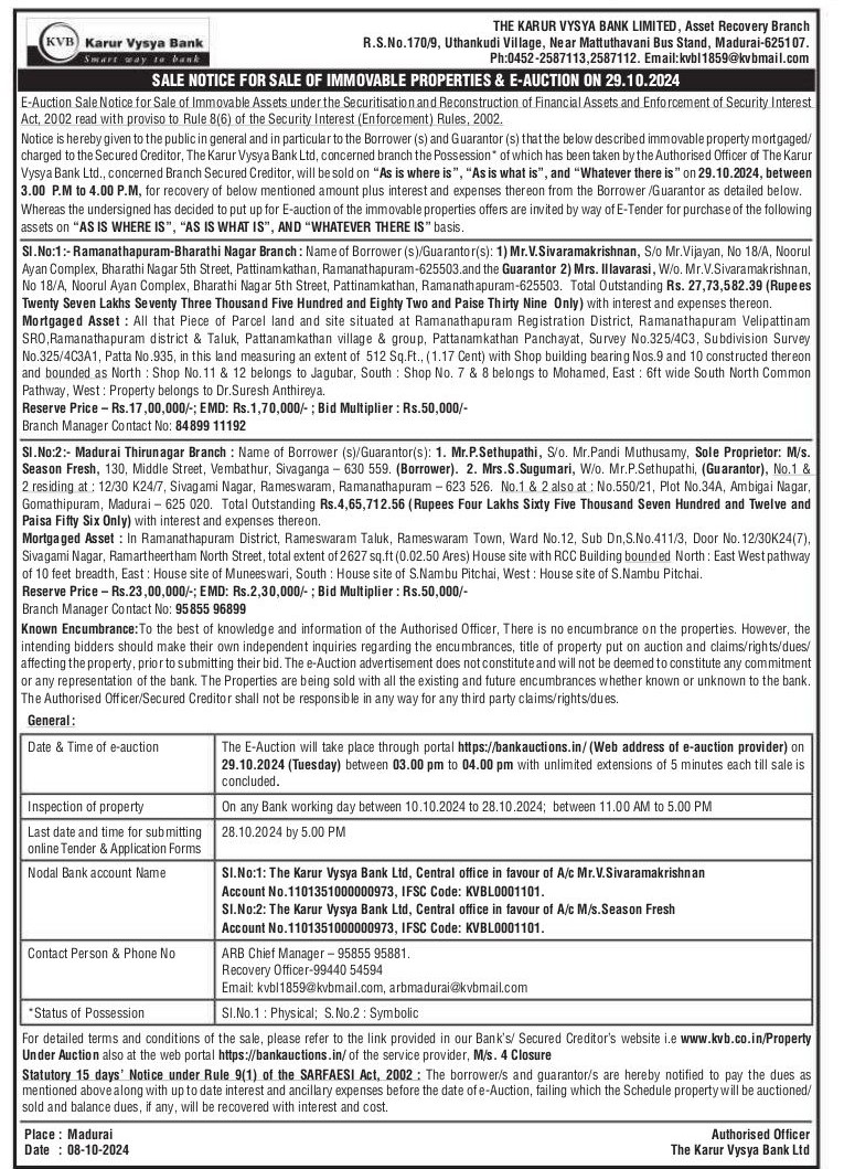 | Contact Details: | Contact The Authorized officer : Ph:0452-2587113,2587112. Email:kvbl1859@kvbmail.com 8489911192, 9944054594 |