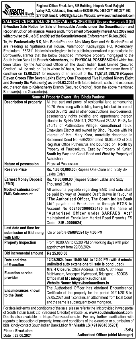 | Schedule of Property: | All that part and parcel of residential land admeasuring 50.70 Ares along with building having total built in area of about 370 m2 and all other constructions, improvements, easementary rights existing and appurtenant thereon situated in Sy No 284/11/1, 282/3B and 282/3A, Re Sy No 210/13 of Pattimattom Village, Kunnathunad Taluk, Ernakulam District and owned by Bindu Paulose with life interest of Mrs. Mary Kora, morefully described in Settlement Deed No. 656/2002 dated 18.03.2002 of Sub Registrar Office Puthencruz and bounded on North by Property of Paulosekutty, East by Property of Kurian, South by Way and Canal Road and West by Property of Avarachan. |
