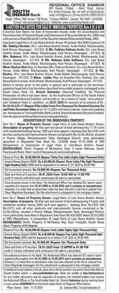 | Schedule of Property: | Description of property: All that part and parcel of land admeasuring 17.75 Cents with residential building having 1200 sq.ft area (approx.) bearing Door No.1/345 with all other usufructs and improvements thereon comprised in Re-Sy.No.263/pt, situated in Pavoor Village, Manjeshwaram Taluk, Kasaragod District, more particularly described in Registered Sale Deed No. 12/2009 dated 01.01.2009 of SRO Manjeshwar, in possession of Legal Heirs of Late. Bawa Ibrahim Ansari. BOUNDARIES North Property of Mr.Ibrahim, East: 3 meter Pathway, South: Panchayath Road, West: Land of Hassankunhi and small pathway. |