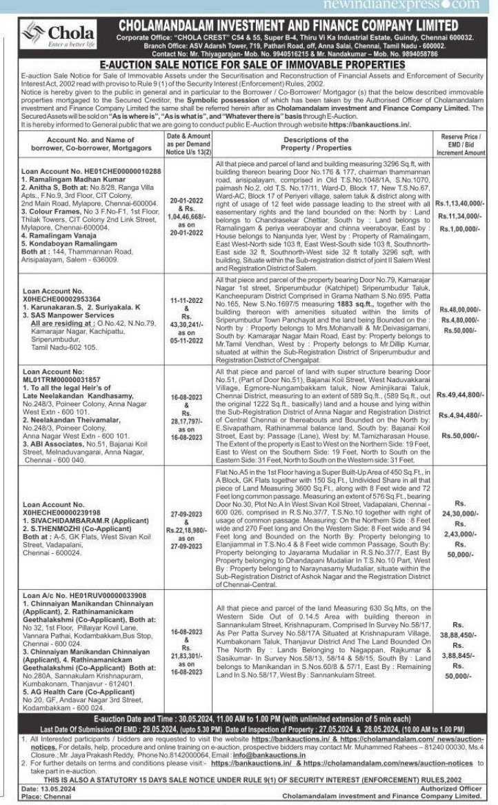 | Contact Details: | Contact The Authorized officer : Mr. Thiyagarajan- Mob. No 9940516215 Mr Nandakumar Mob. No 9894058786,Mr.Mohammed Rahees, 8124000030 |