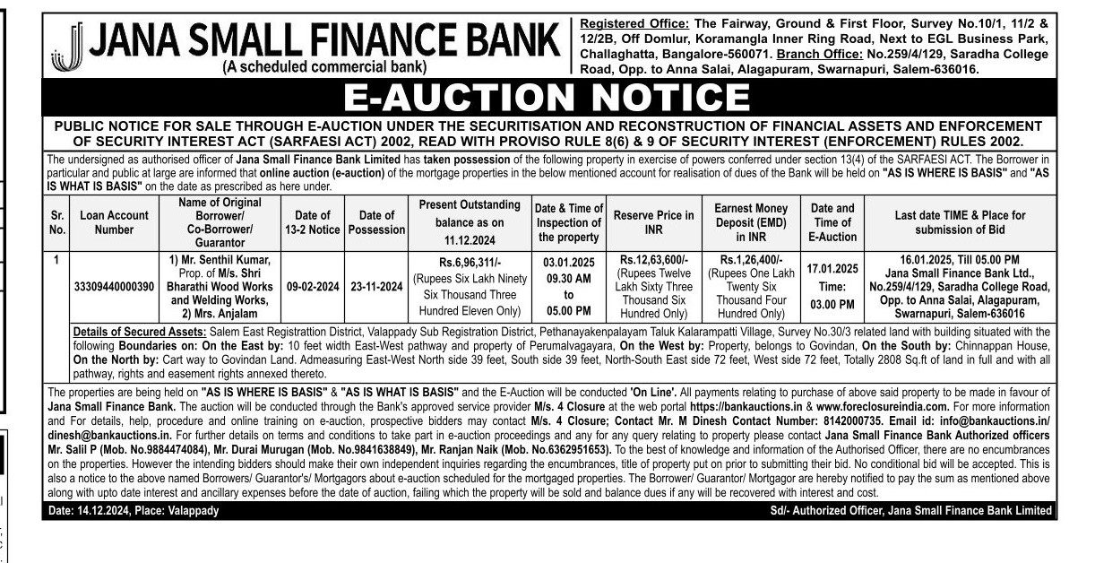 | Contact Details: | Contact The Authorized Officer:Mr. Salil P (Mob. No.9884474084), Mr. Durai Murugan (Mob. No.9841638849), Mr. Ranjan Naik (Mob. No.6362951653). |