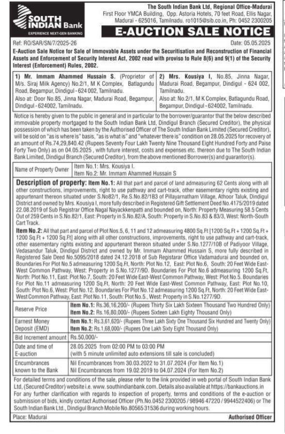 | Contact Details: | Contact The Authorized Officer: 0452 2300205 / 9944522406/ 9894647220 |