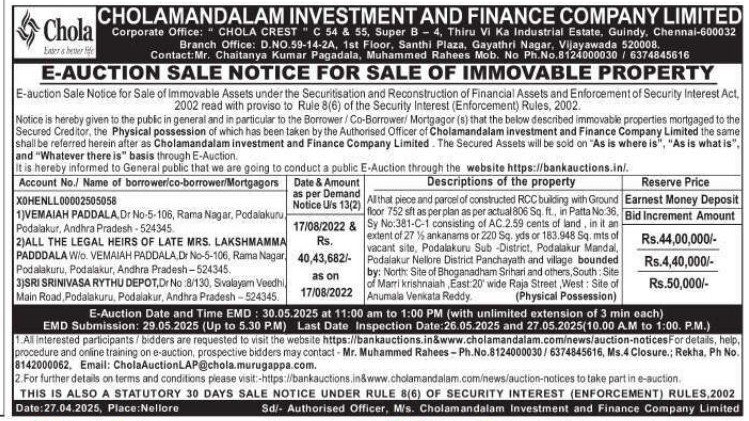 | Contact Details: | Contact The Authorized Officer: Mr. Chaitanya Kumar Pagadala , Muhammed Rahees: 8124000030, 6374845616 |